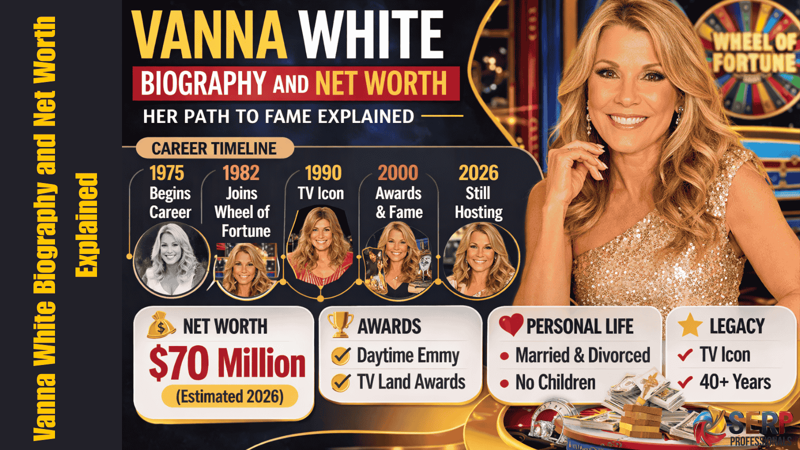 Explore Vanna White’s biography and net worth, from her early life in South Carolina to becoming a television icon on Wheel of Fortune. Discover her career, achievements, and personal life.
